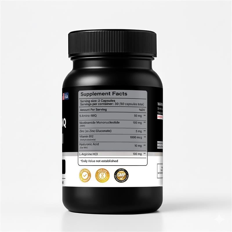 This dietary supplement contains 5-Amino-1MQ combined with vitamins, minerals, and amino acids in convenient capsule form.