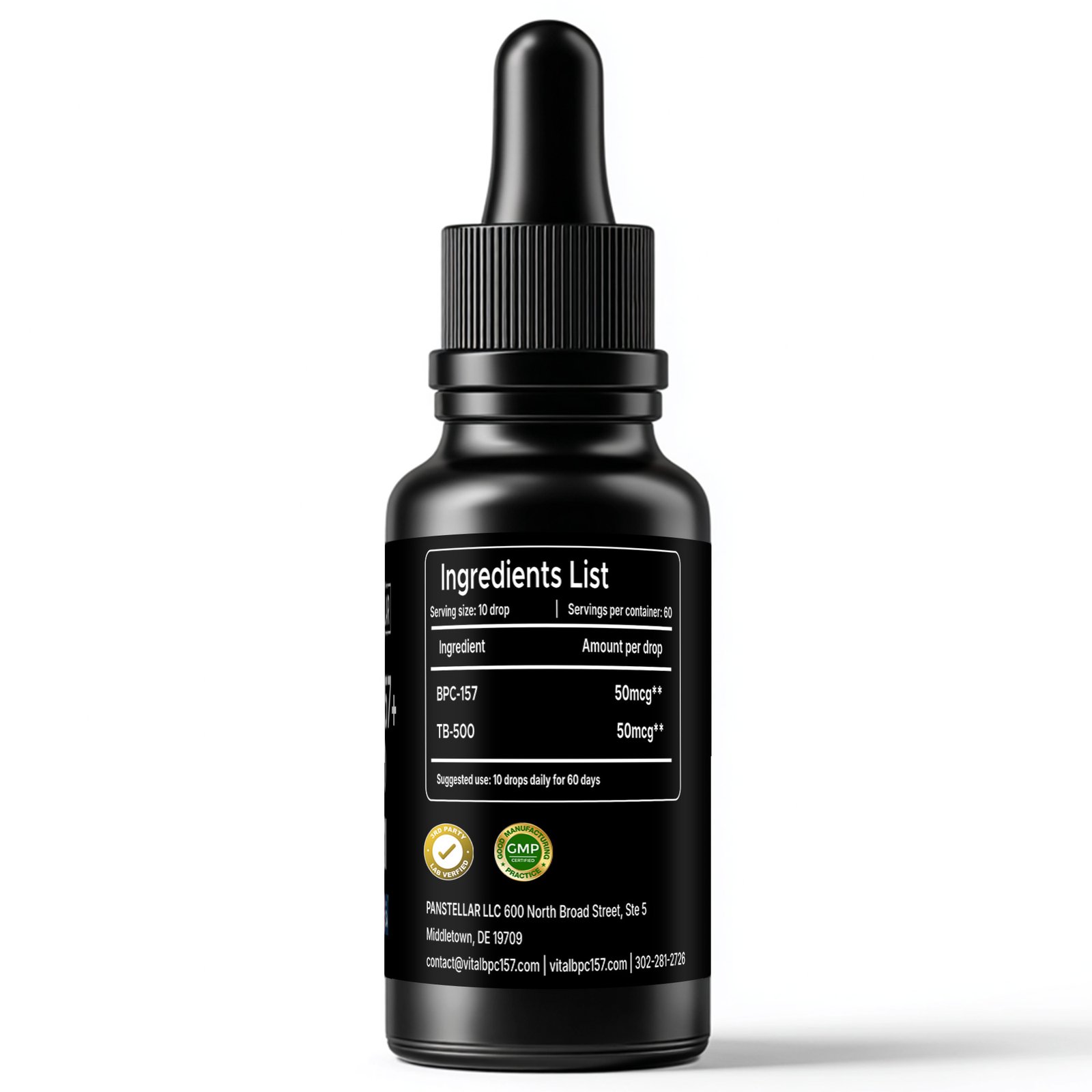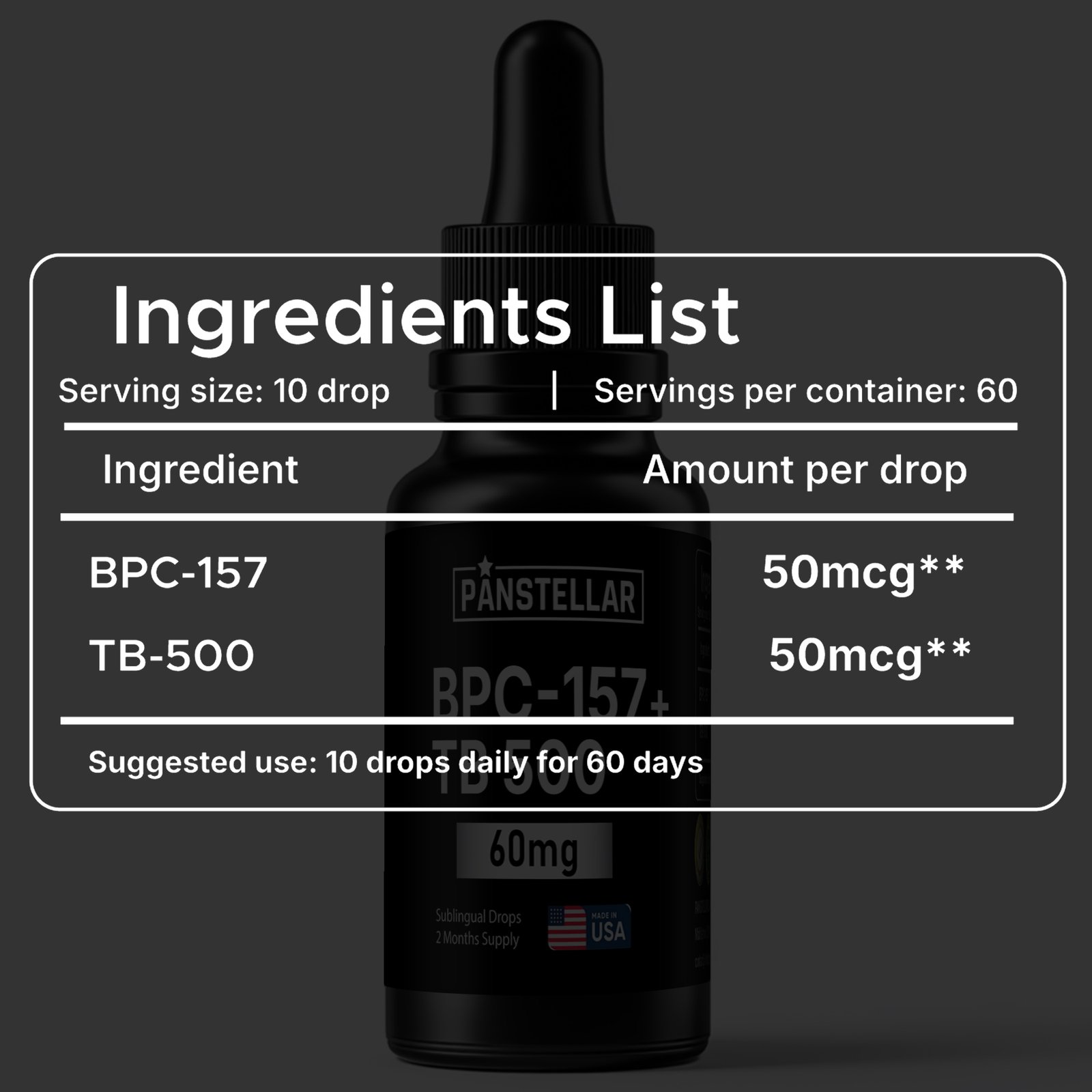 - Daily dosage: 10 drops (1,000 mcg total peptides)
