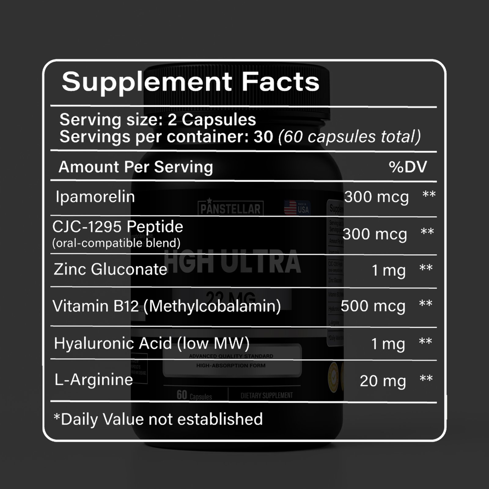 This specialized nutritional supplement combines research-grade peptides Ipamorelin and CJC-1295 in stable oral form, with complementary amino acids, vitamins, and minerals in convenient capsule format.